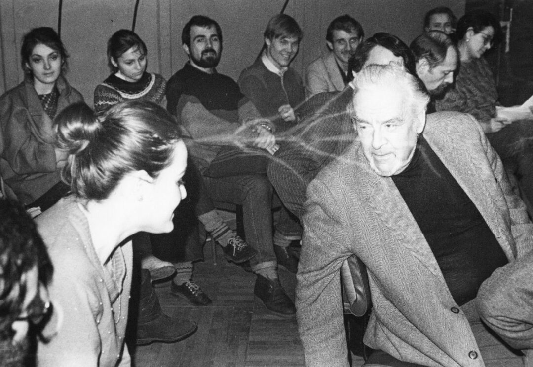 Théâtre Maïakovski, 1986. Stage de mise en scène (Stathis Livathinos troisième à partir de la gauche), enseigné par le grand professeur,Andreï Alexandrovitch Gontcharov (1918-2001). Source: stathislivathinos.com