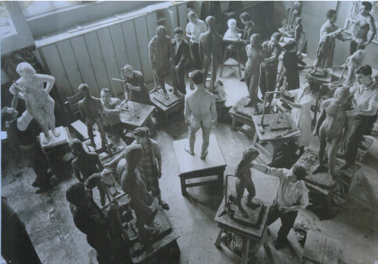 Atelier du professeur Michalis Tobros à l’École des beaux-arts d’Athènes 1956-1957. Théodoros est à droite sur la photo. Source: Theodoros.net